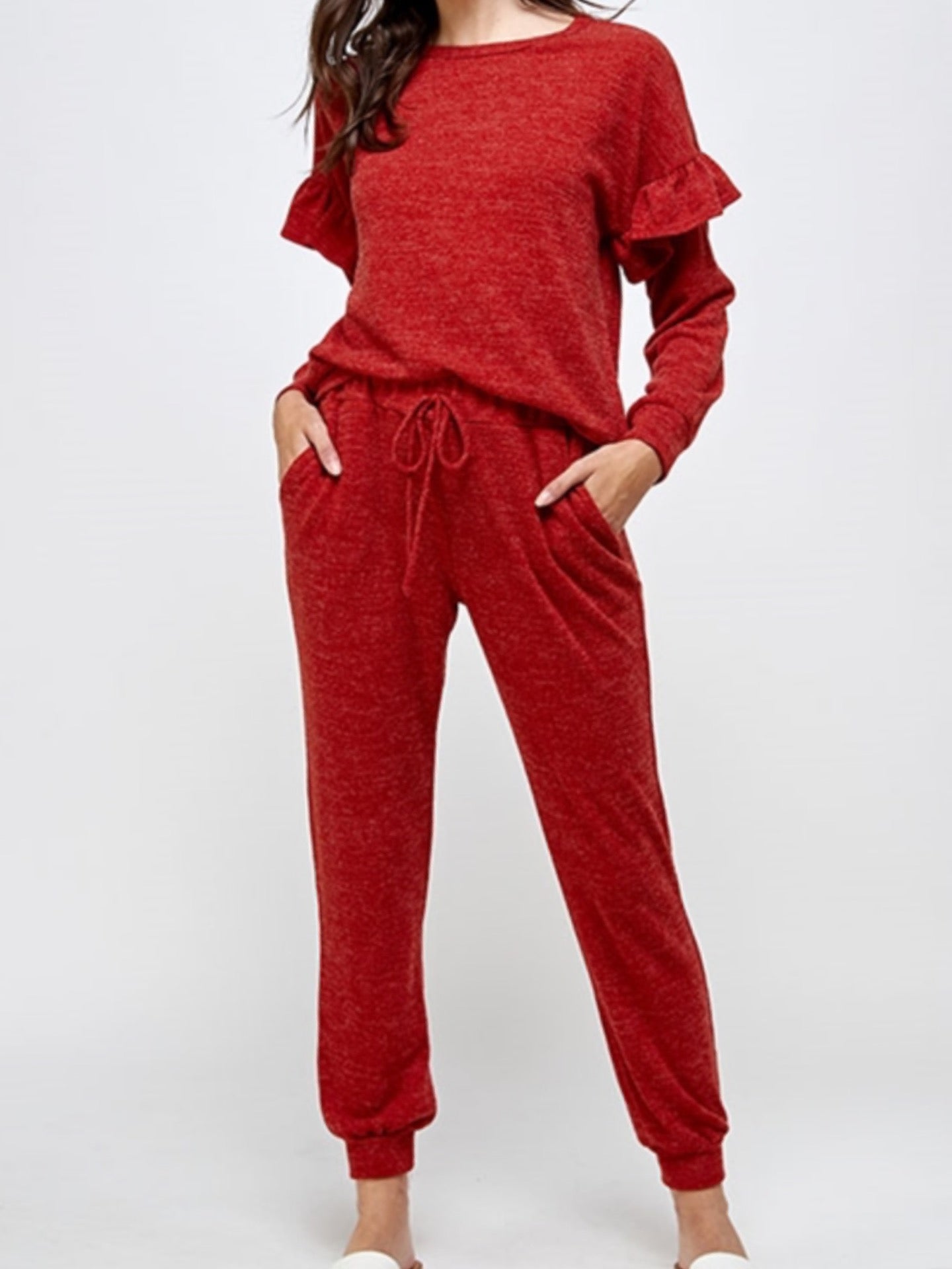 Plus size long sleeve with ruffle detail round neck top and jogger pants set.