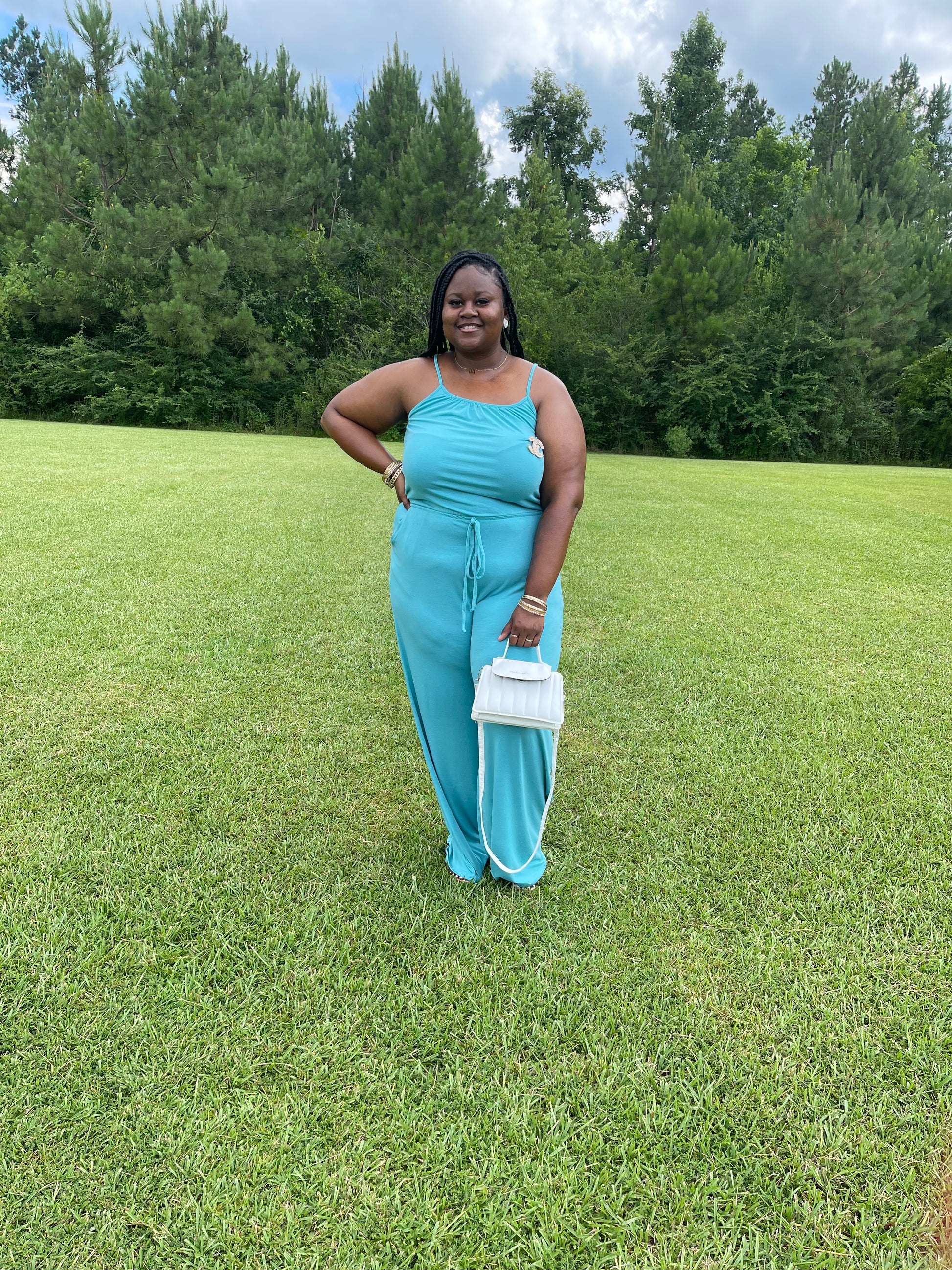 Spaghetti strap jumpsuit with pocket and adjustable straps.